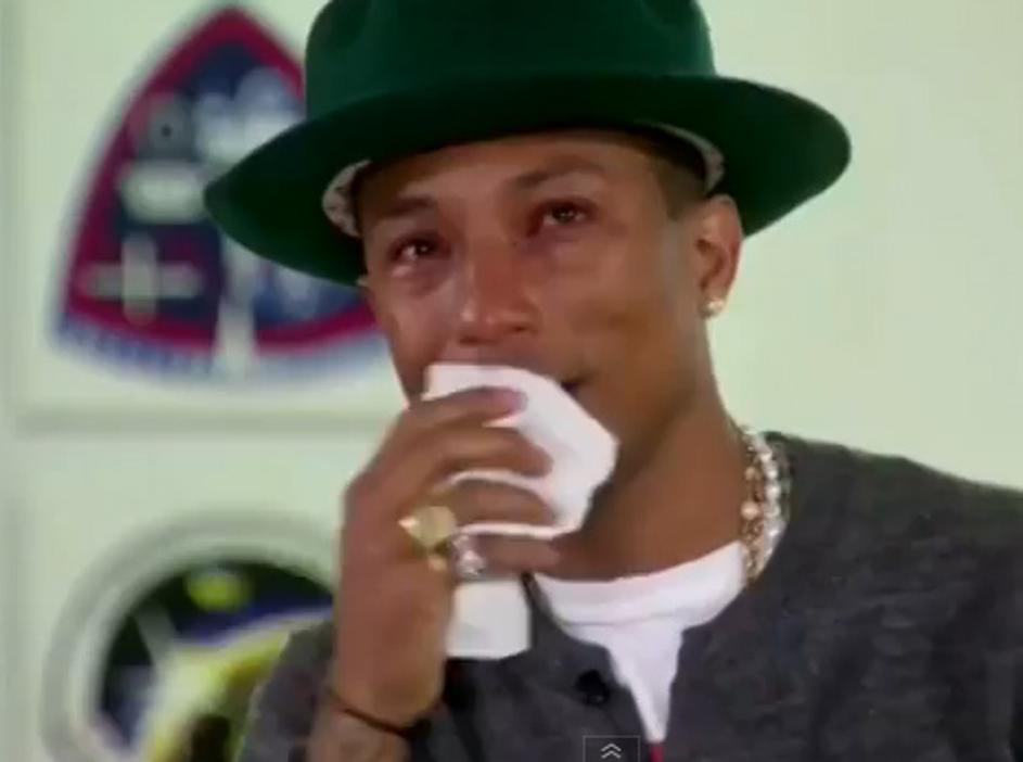 Pharrell WilliamsTudi Pharrell Williams je car, ker se ni zadrževal in je svetu pokazal, kako čustven zna biti. Ko je videl, kako priljubljena je njegova pesem Happy, so ga oblile solze. Oh, kako lepo! Youtube