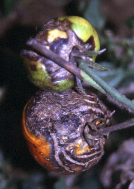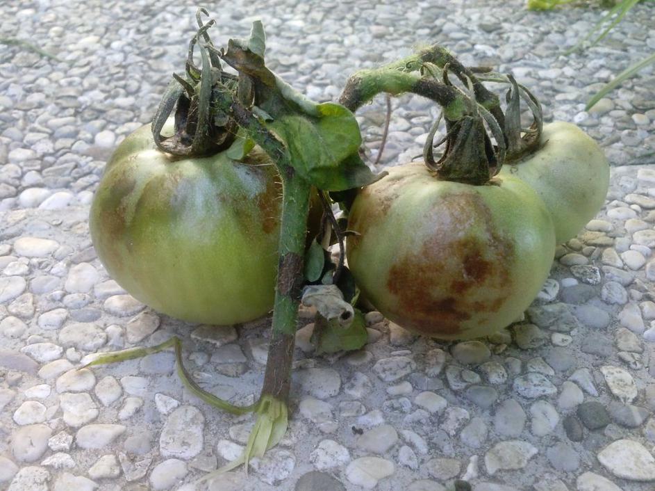 Plesen paradižnikaNa steblu se pojavljajo temne pege elipsaste oblike, na zelenih plodovih pa opazimo temnejše vdrte pege. Klub Gaia