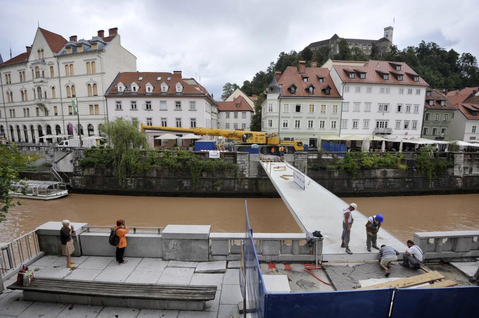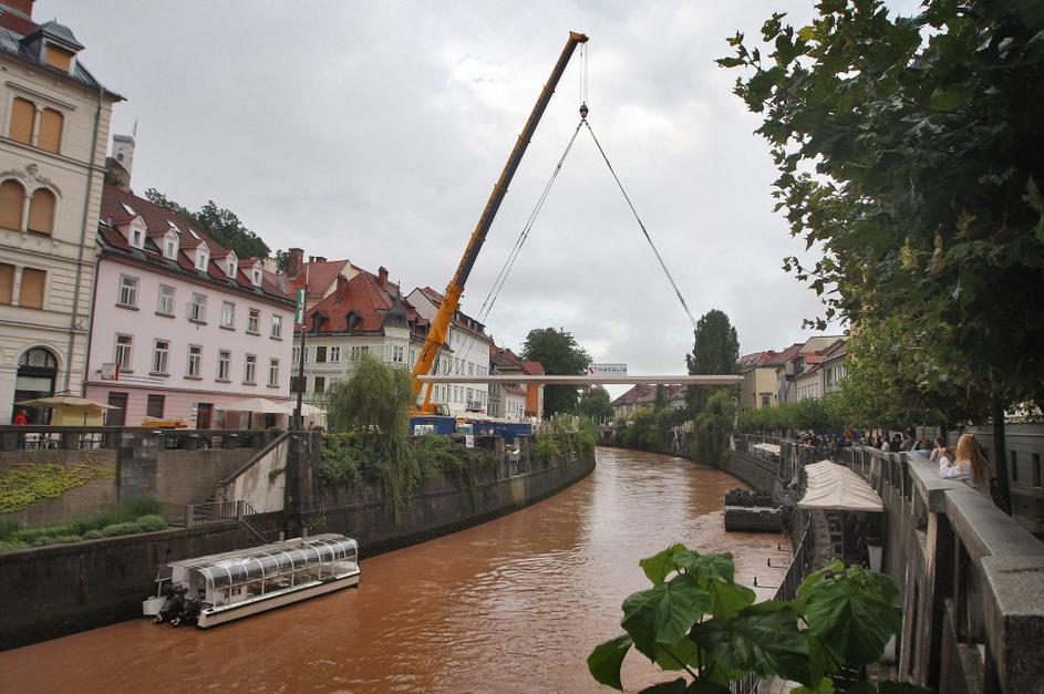 Montaža železne konstrukcije za novo Ribjo brv v Ljubljani