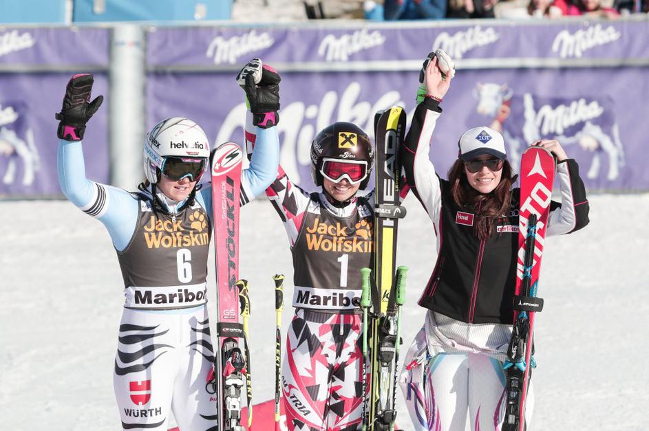 Anna Fenninger (sredina) je slavila pred Viktorio Rebensburg (levo) in Tino Weirather.