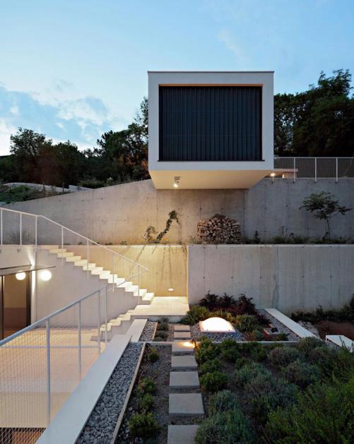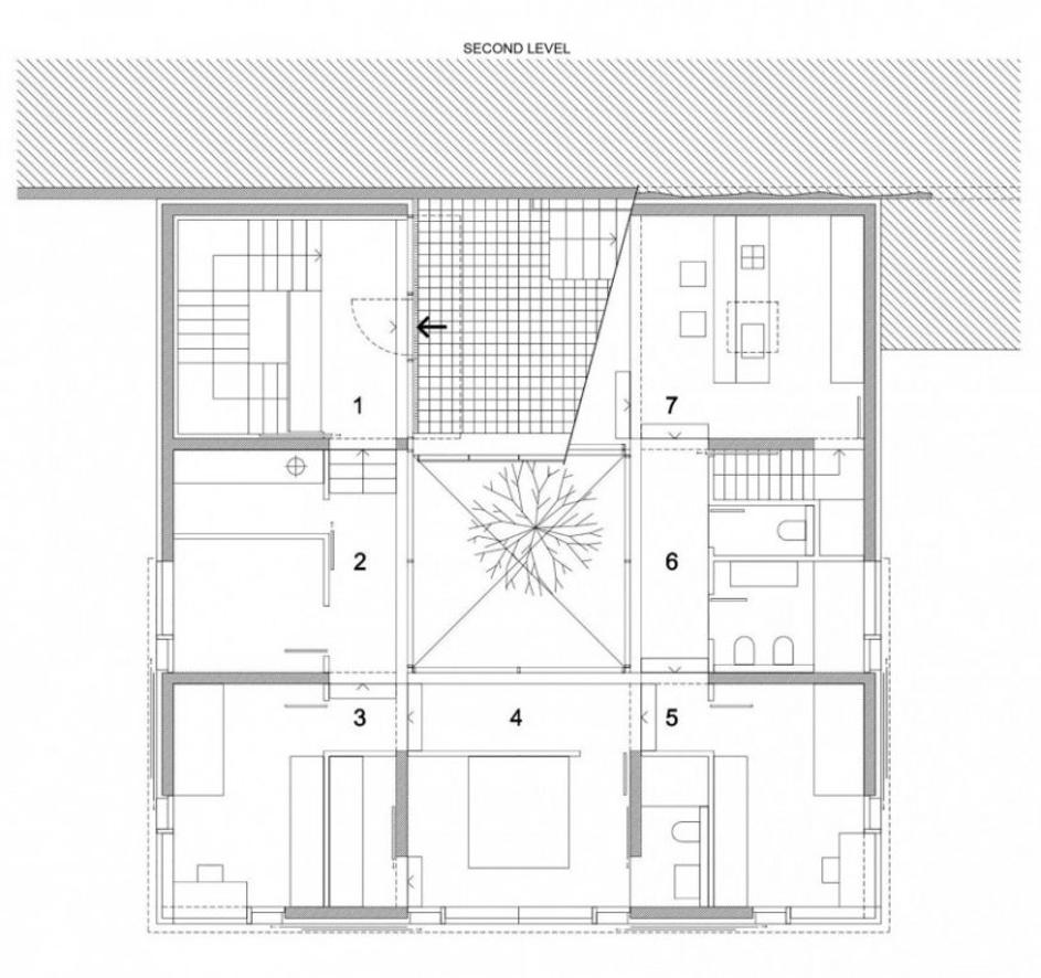 Hiša je v breg vsajena, zato je notranji atrij potreben, če želimo, da v vse prostore pride dovolj naravne svetlobe.