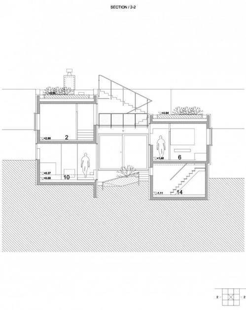 Objekt nima klasičnega pritličja in nadstropja, ampak je ustvarjena neprekinjena topografija prostorov.