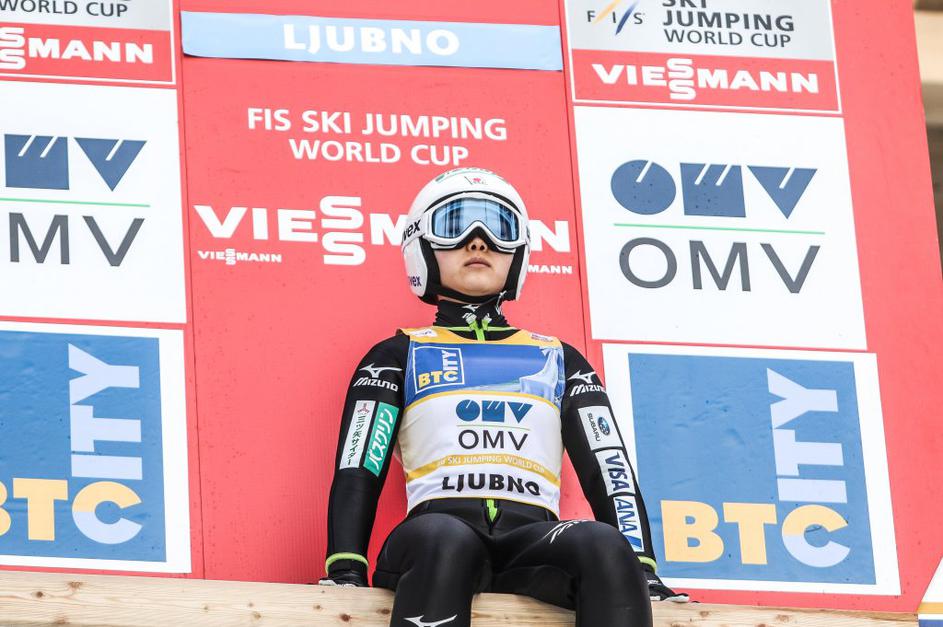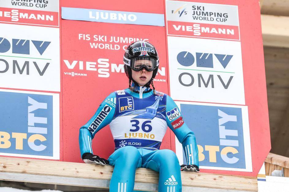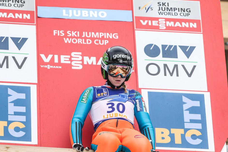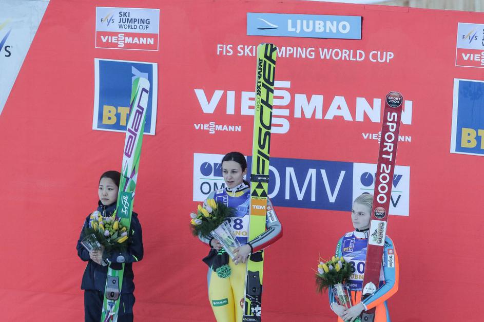 Maja Vtič (sredina) je poskrbela za drugo slovensko zmago v zgodovini ženskih smučarskih skokov.