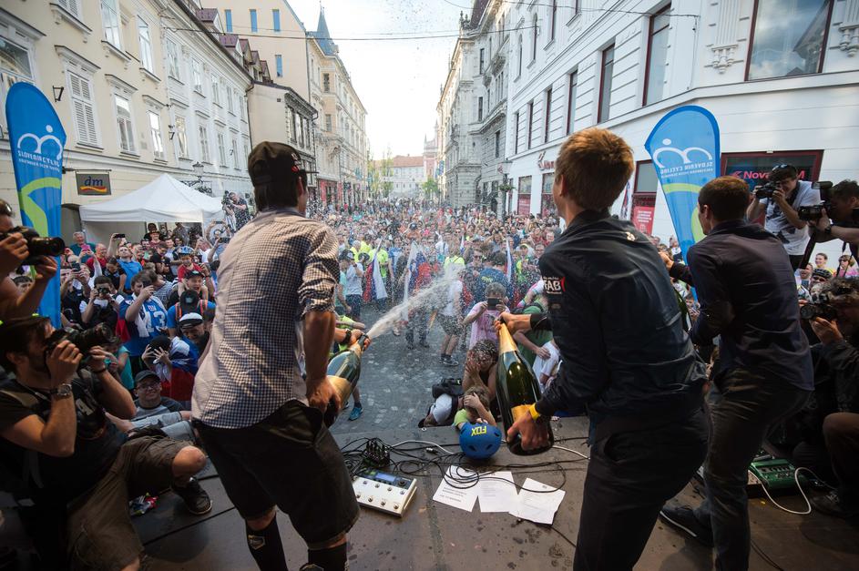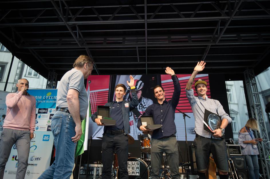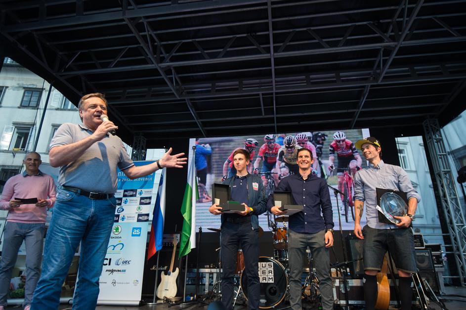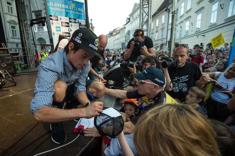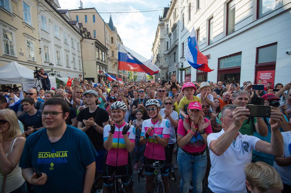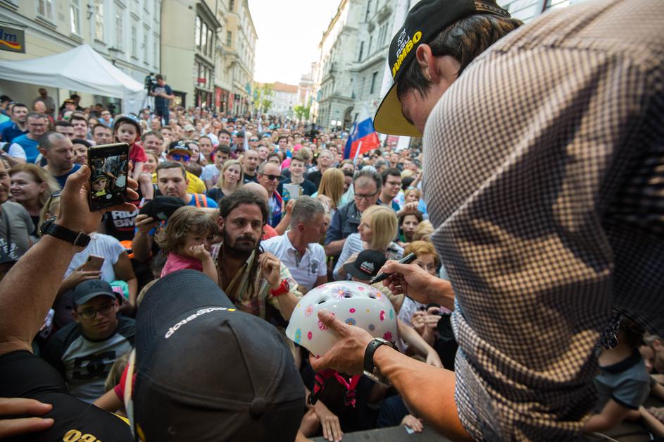Primož Roglič, Tadej Pogačar in Jan Polanc na sprejemu v Ljubljani.