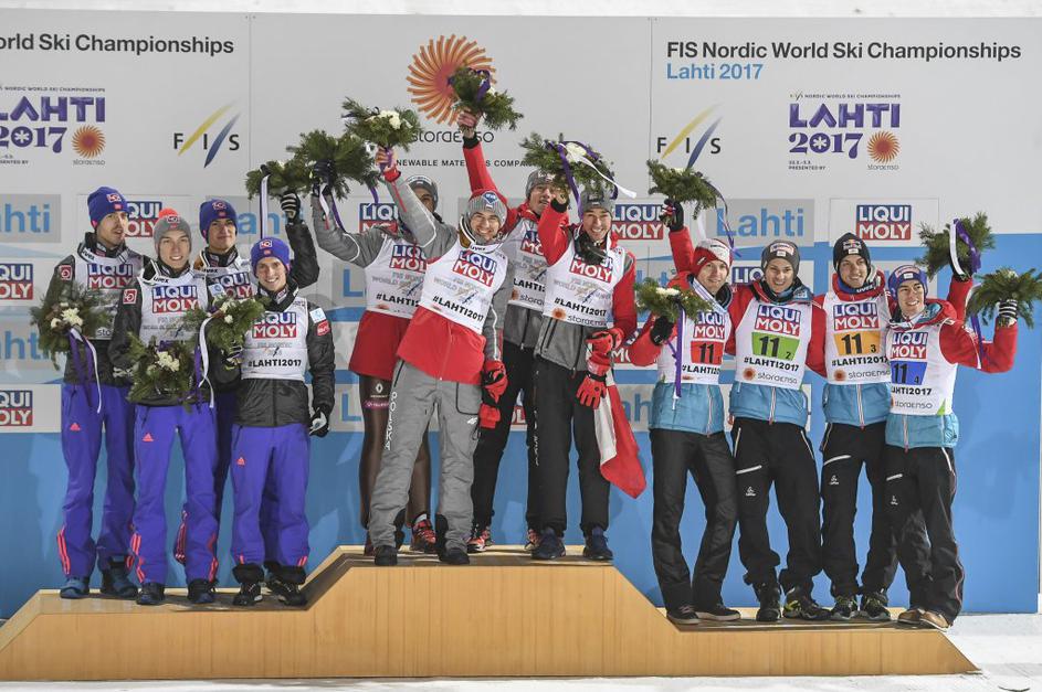 Družbo na stopničkah so jim delali zdaj že nekdanji svetovni prvaki Norvežani in Avstrijci.