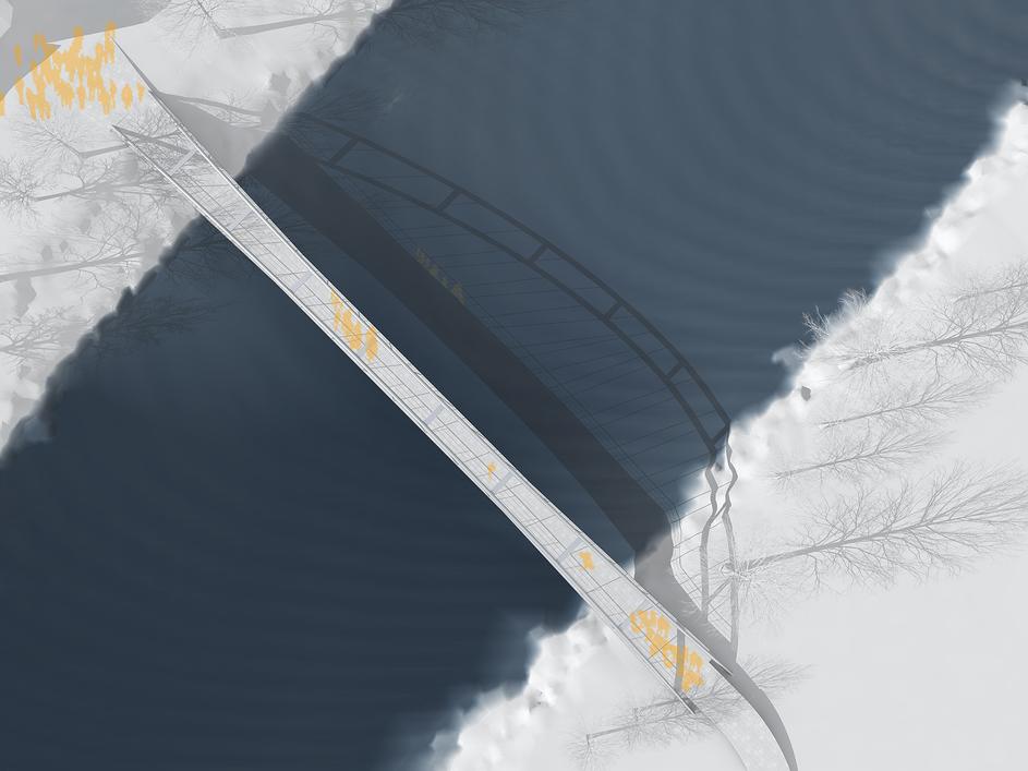 Tako bo zgledala nova brv čez reko Savo do medvoške občinske stavbe in knjižnice. Dolga bo 138 metrov z razponom 86,6 metra. Projektiral jo je dr. Jaka Zevnik iz podjetja Elea iC.