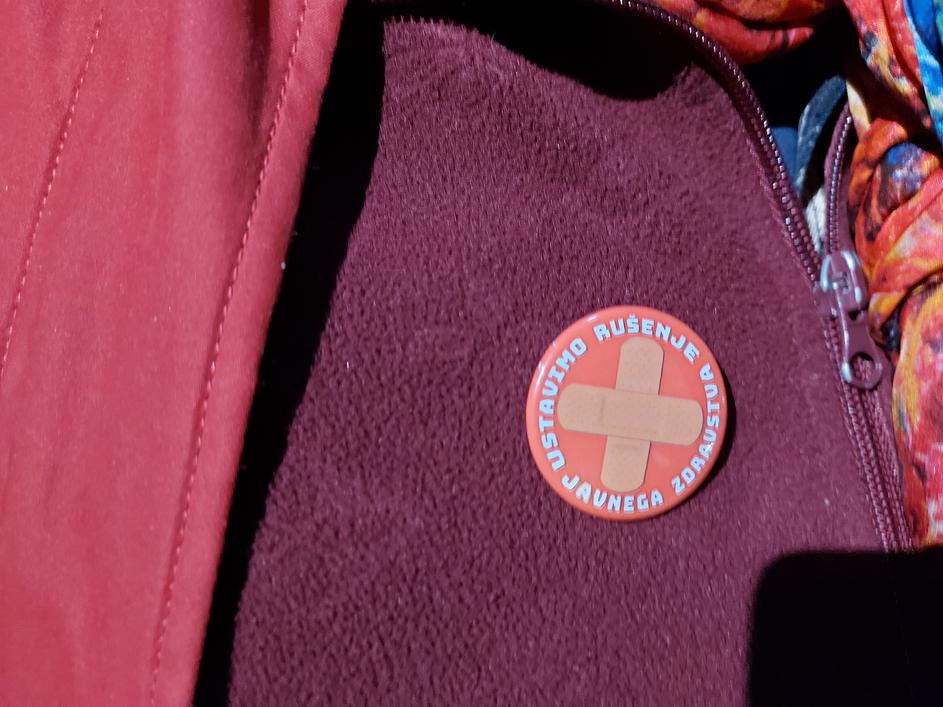 Značka, ki so jo nosili protestniki na shodu pred Zdravstvenim domom Kranj, posneto 10. januarja, 2023.