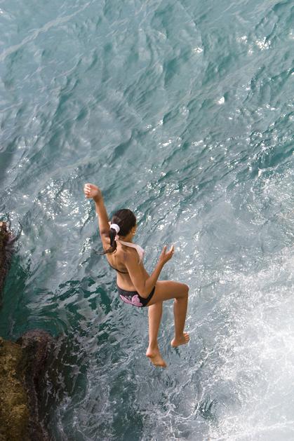 Dekle skače v vodo, skok v vodo