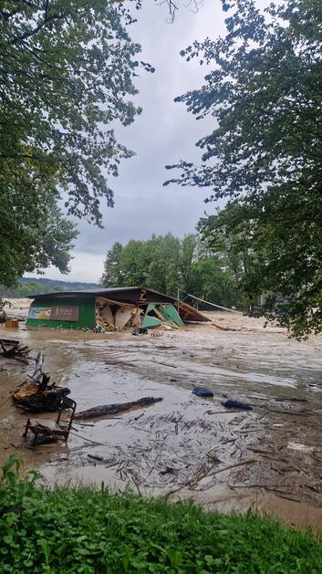 Kataklizmični prizor v Medvodah, posneto 4. avgusta 2023. Podivjani Sora in Sava sta danes zalili mesto.