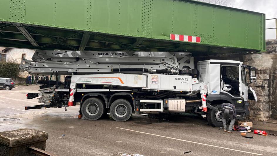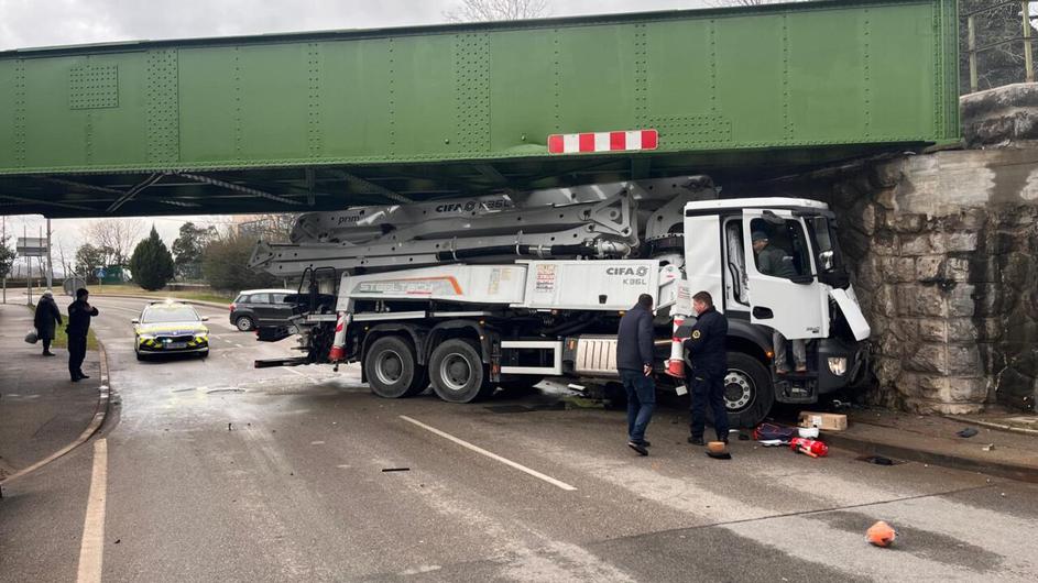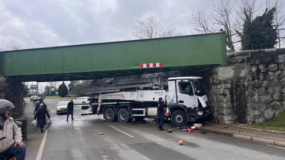 zagozden tovornjak pod nadvozom v Solkanu