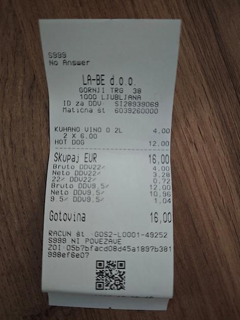 Račun za hot dog in kuhano vino