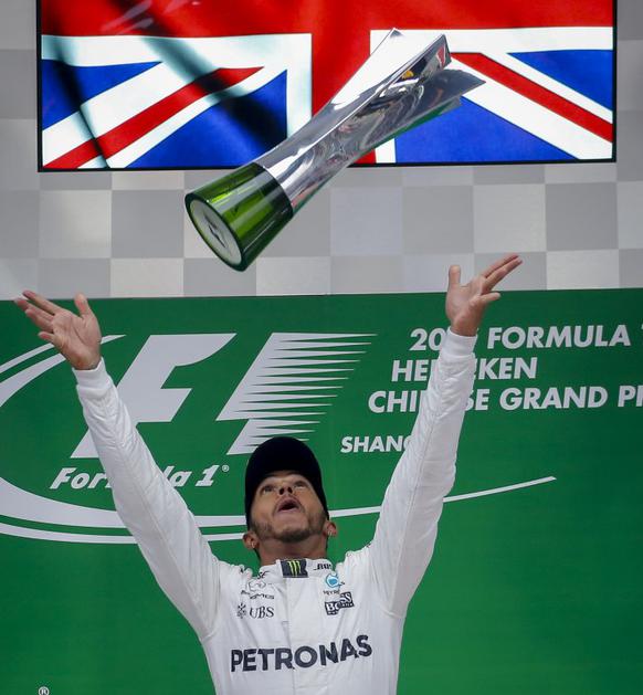 Slavje Hamiltona na zmagovalnem odru.