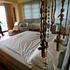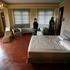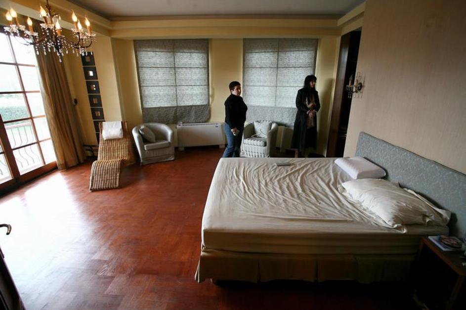 Na oknih v spalnici so še vedno spuščene žaluzije.