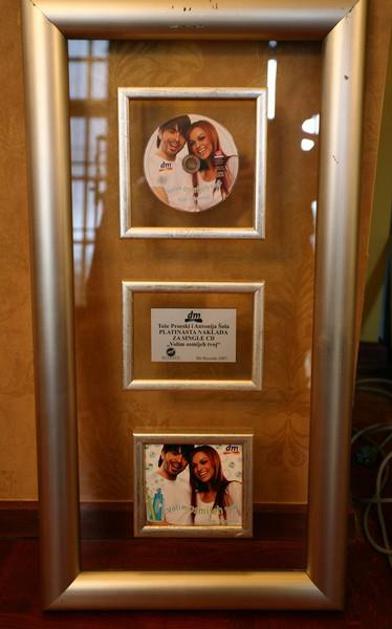 Vetrina z njegovo platinasto ploščo.