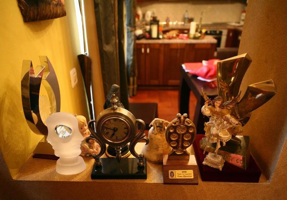 Številne nagrade, ki jih je dobil, samevajo na polici.
