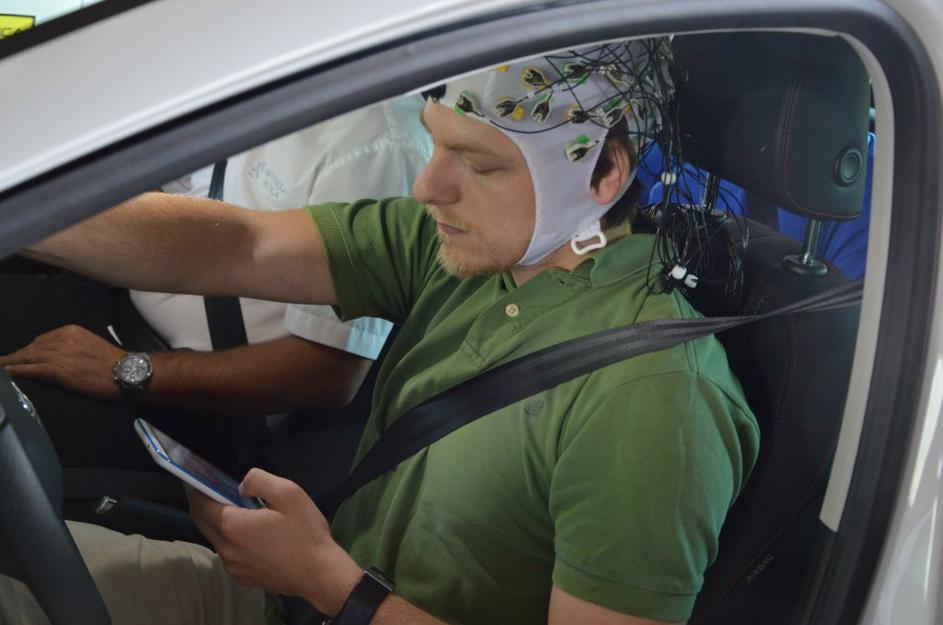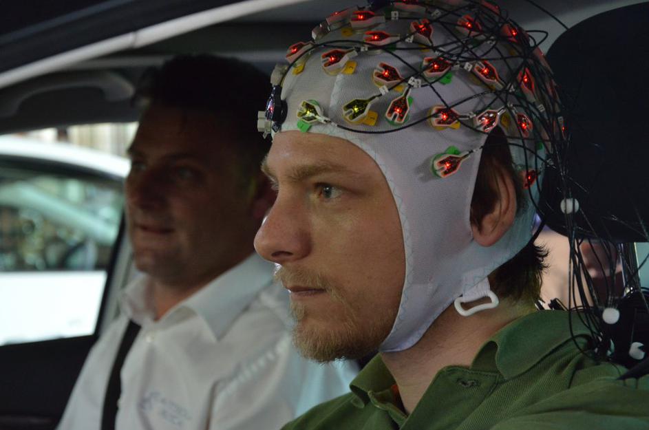 Testni voznik s posebno kapo, na katero je navezan 64-kanalni sistem senzorjev EEG. Andrej Leban