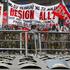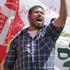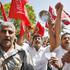 Delavci z dvignjenimi rokami vzklikajo prvomajske slogane. Žurnal24