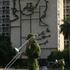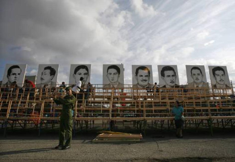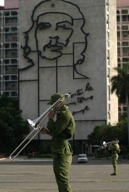 Vojak igra na trobento pred sliko Che Guevare v Havani. Žurnal24