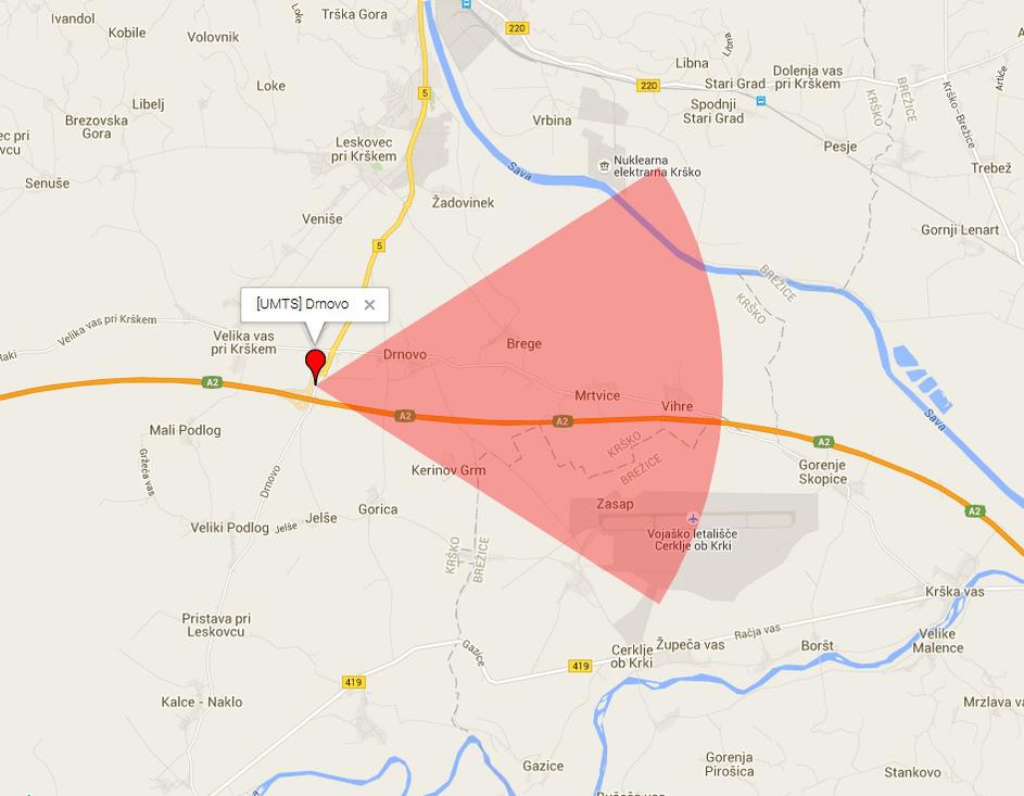 Prikaz usmerjenosti bazne postaje slovenskega mobilnega operaterja na lokaciji Drnovo.