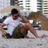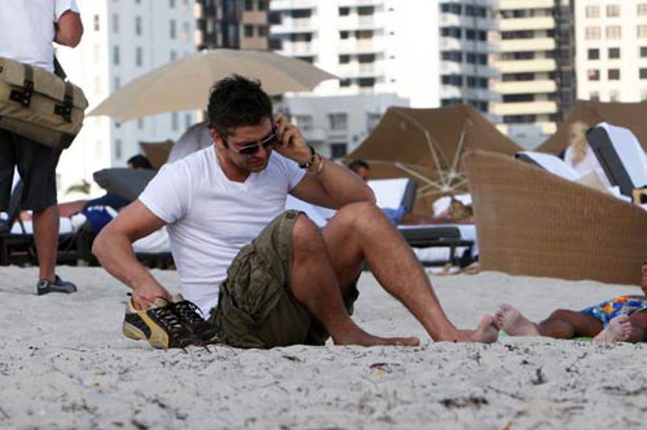 Gerard Butler je na plaži najprej prebiral sms-sporočila, nato pa opravil še klic ali dva.