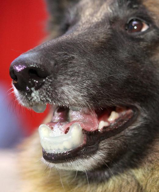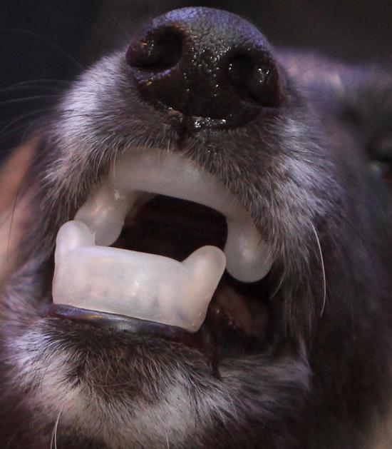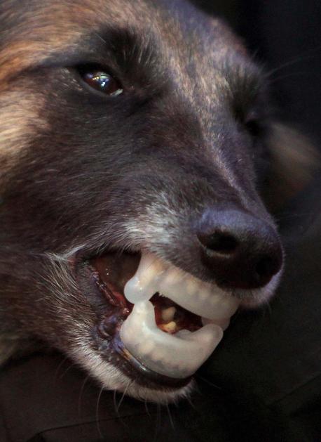 Ščitnik proti pasjim ugrizom, ki se namesti na zobe psa.