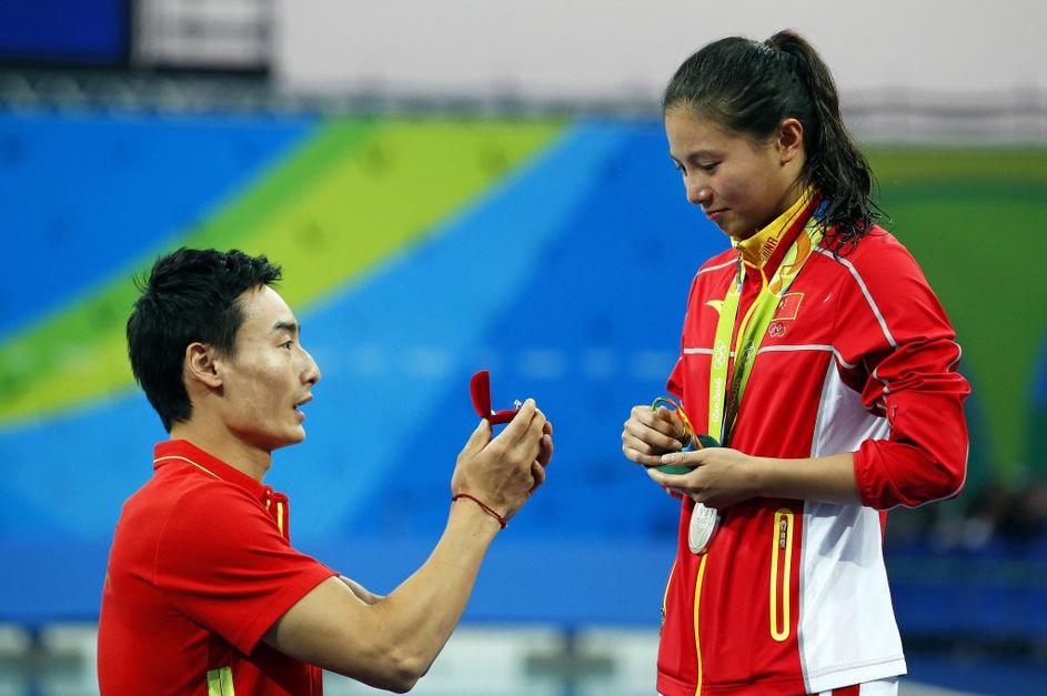 Dogodki Rio 2016Kar nekaj prošenj za ženitev je zaznamovalo OI. Skakalka v vodo He Zi je pravkar prejela srebro, ko jo je njen reprezentančni kolega Qin Kai zaprosil za roko. Pristala je. EPA