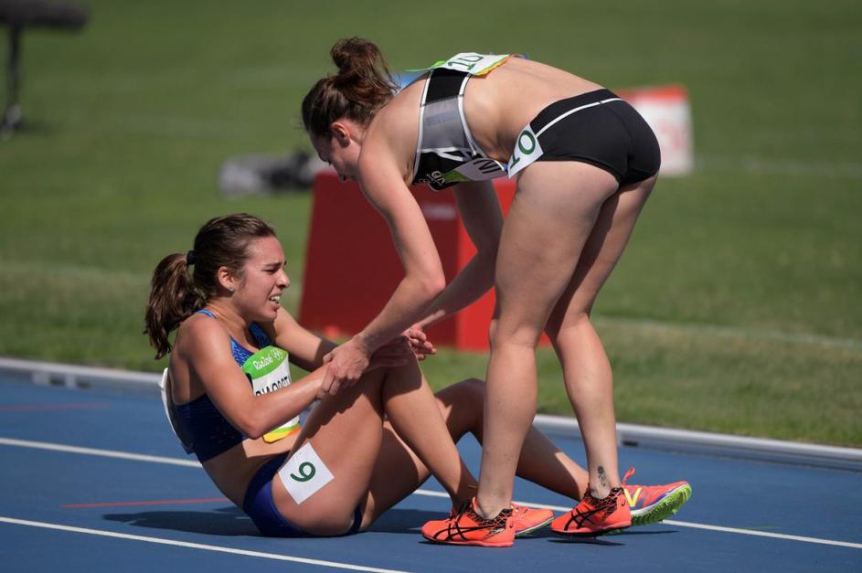 Dogodki Rio 2016Novozelandka Nikki Hamblin (desno) in Američanka Abbey D'Agostino sta pokazali pravi olimpijski duh. V teku na 5.000 metrov sta padli in se poškodovali, a se nato v bolečinah spodbujali do cilja. D'Agostinova si je potrgala kolenske vezi, a je vseeno zmogla dokončati nastop. Profimedia