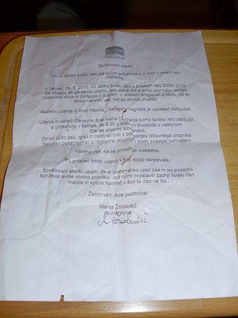 Vabilo na prireditev ob zadnjem šolskem dnevu, katero je želela Alenka obiskati pred obravnavo.