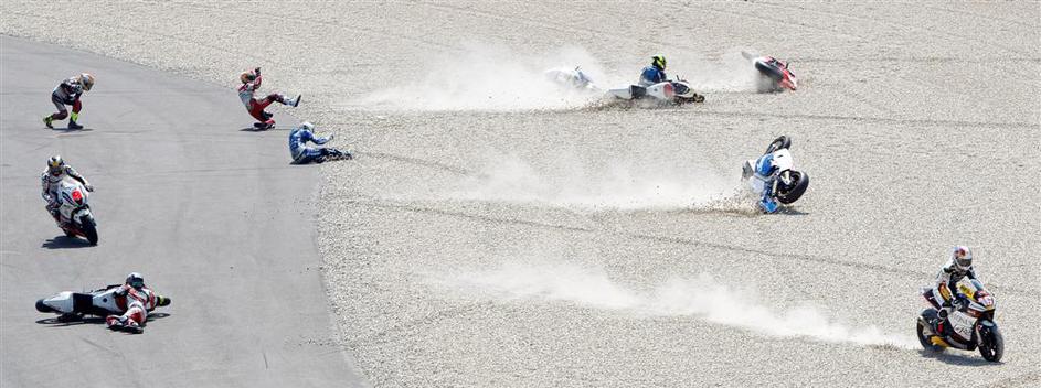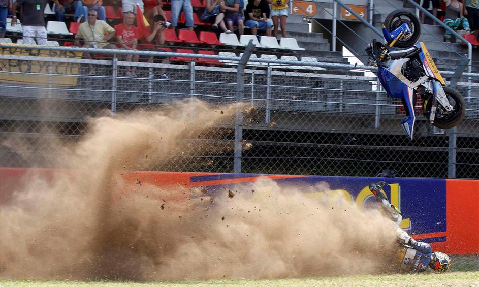 Grozljiv padec Carmela Moralesa v Moto2, ki se je dobro končal v Barceloni.