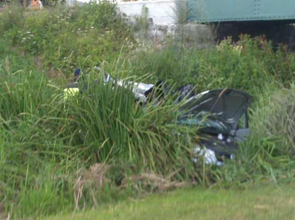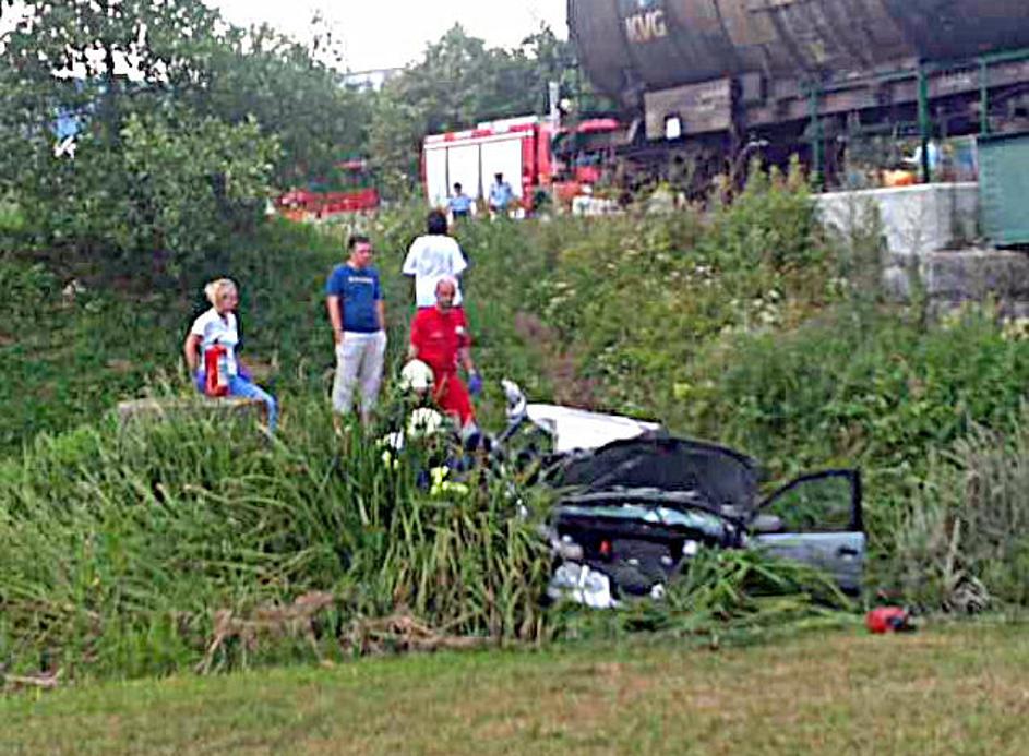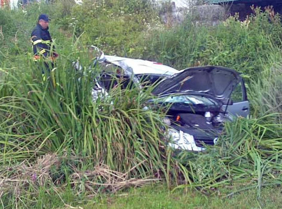 Prišlo je do silovitega trčenja, v katerem je vozilo odbilo s cestišča po brežini.