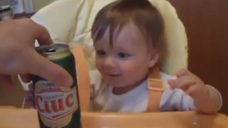 Najmlajša ljubiteljica piva na svetu se pločevinke tako razveseli, da začne kriliti z rokami, brcati z nogami, globoko dihati in kričati. Ko ji pivo izgine izpred oči, pa postane živčna.