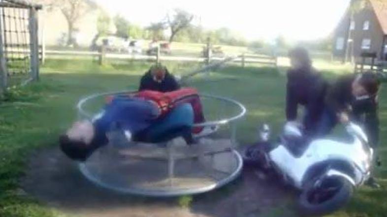 Štirje fantje so na otroškem vrtiljaku motorjem pospešili vrtenje, pri čemer je eden "dobil krila". googletag.cmd.push(function() { googletag.display('divInArticle'); });