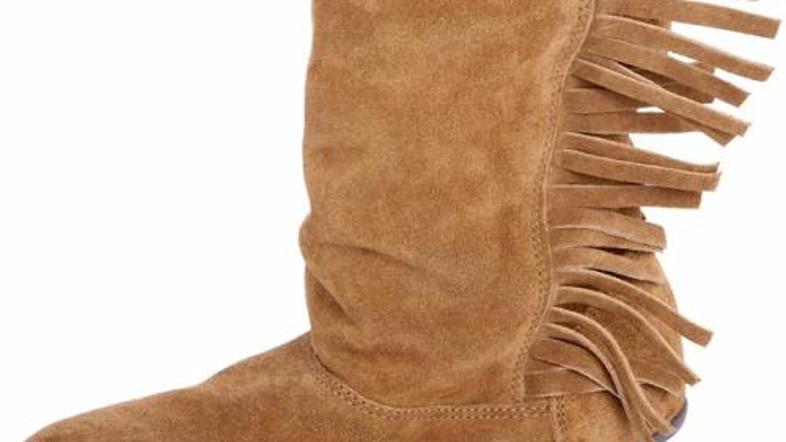 oprijetimi hlačami, vijola tuniko in nizkimi škrnji z resicami.