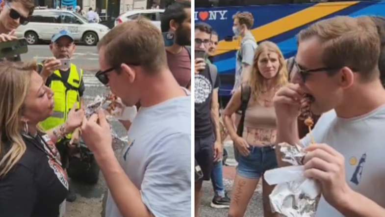 In front of Nike in #NYC where animal rights activists were rallying in front. A man comes off the streets and starts mocking the activists and eats Shushka Bob in front of the activists. Activists start yelling at the man#pita #animals pic.twitter.com/puQ1I9EJlV