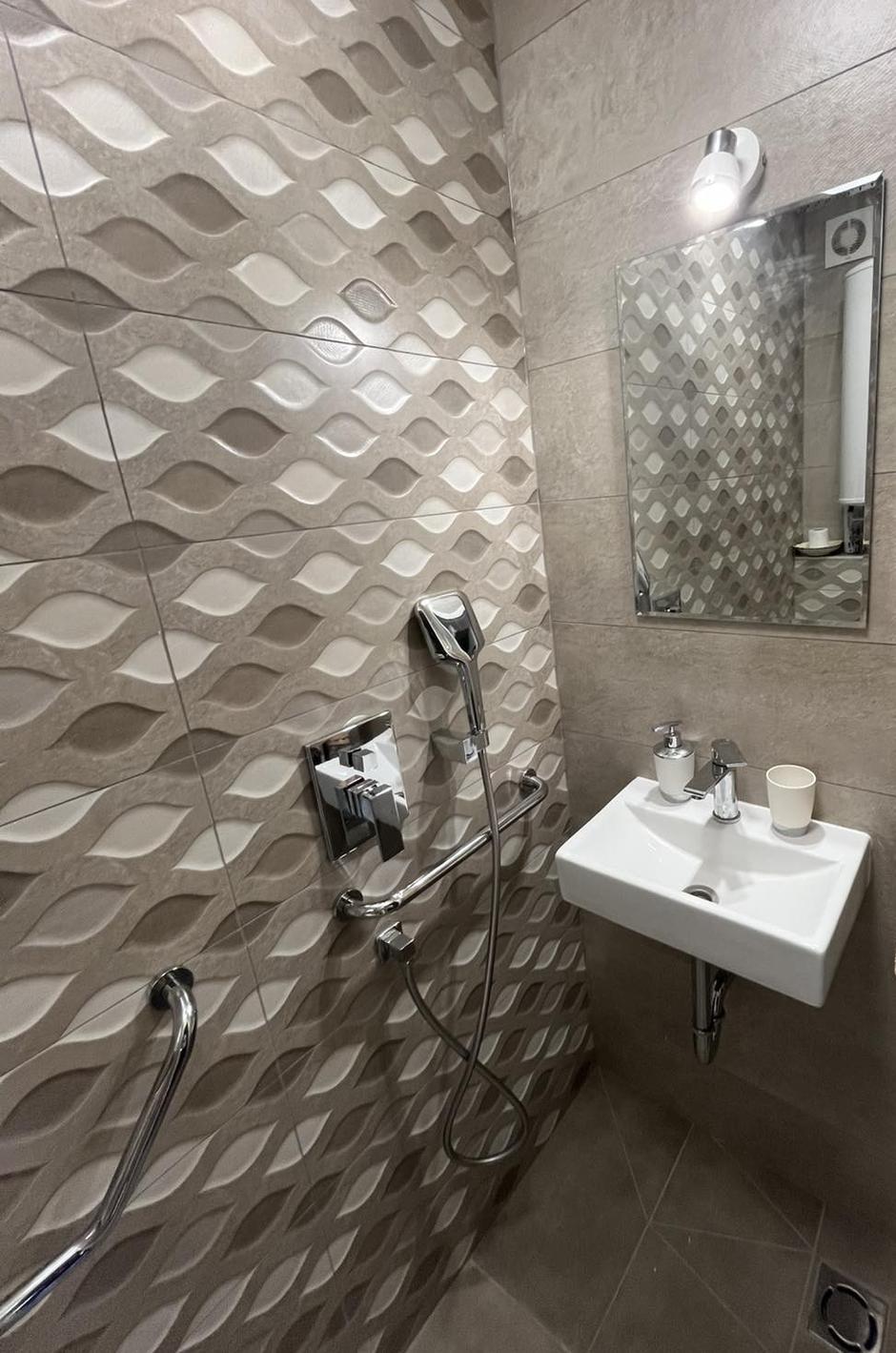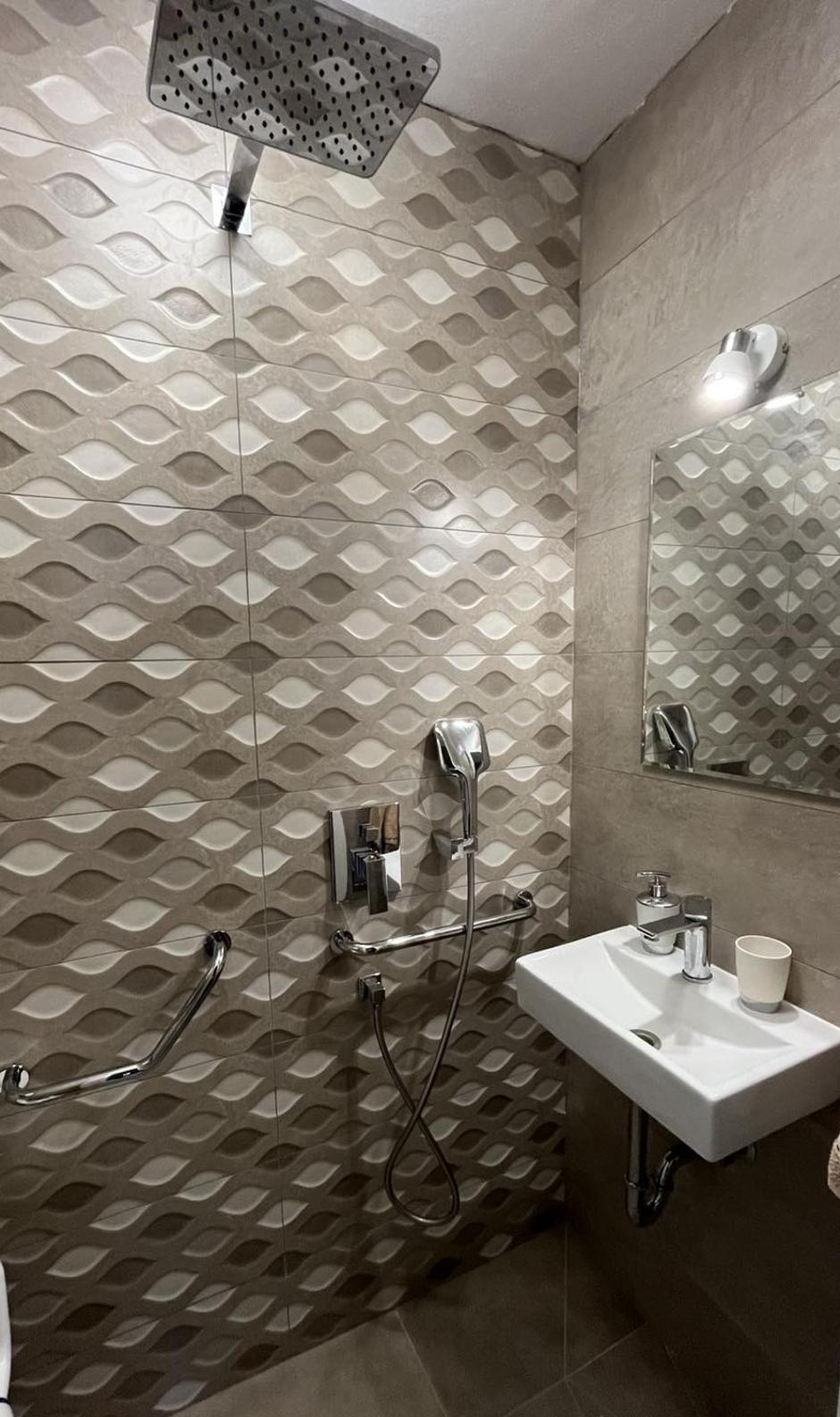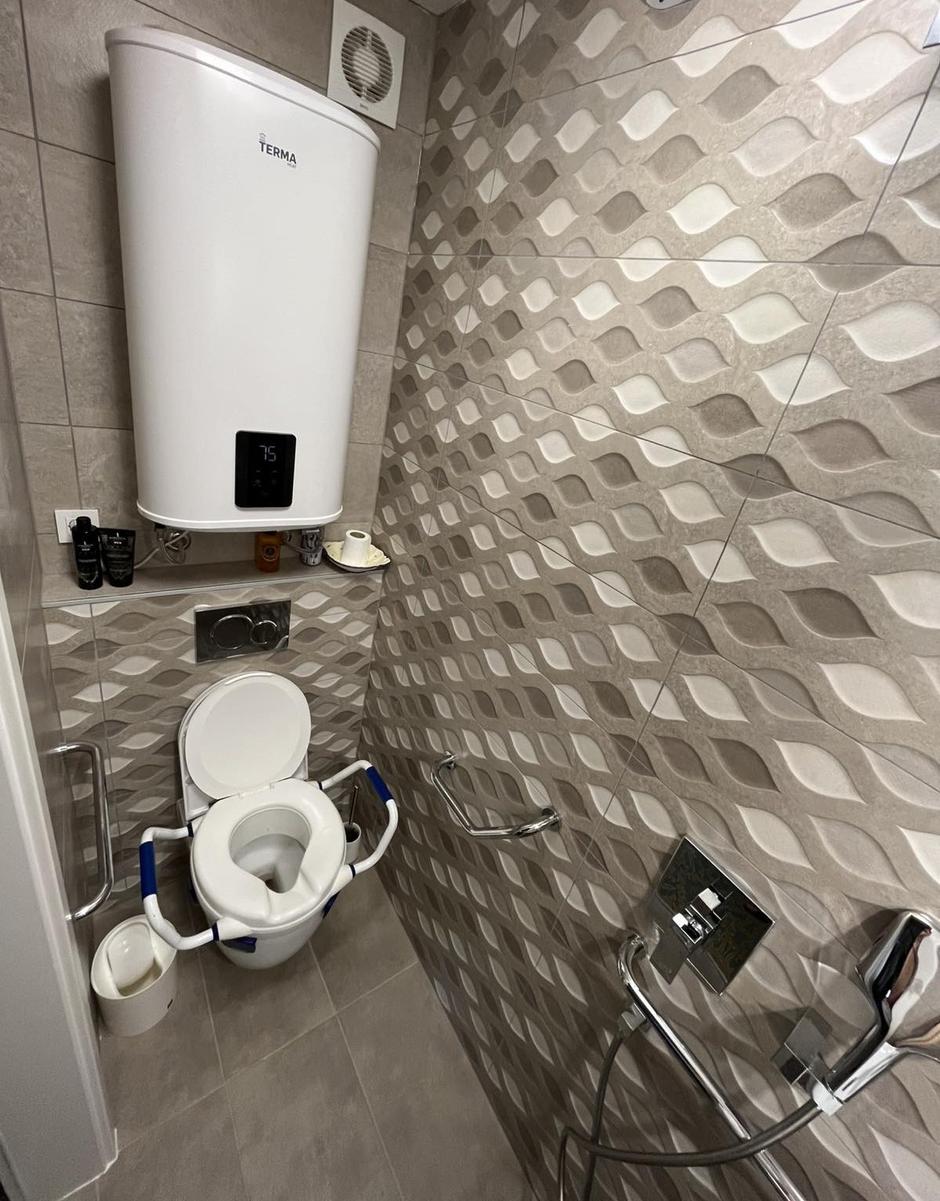 Izvedbo kopalnice so naročili na ključ, njuna naloga je bila le, da izbereta keramične ploščice, umivalnik, straniščno školjko, armature, ogledalo, nova svetila in seveda ročke za oprijemanje, ki so jih namestili po stenah.