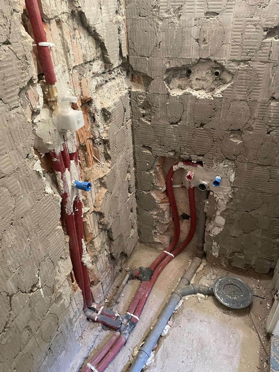 Po rušitvenih delih so v prostoru ostale le grobe stene in tla, popolnoma vse je šlo ven, tudi vrata, s podboji vred, pripoveduje Urša. Položiti je bilo treba nove cevi, urediti odtok za WC in odtok za vodo iz prhe, talni sifon, preboje za prezračevalnik.