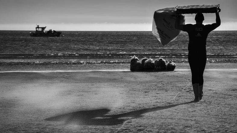 Hodiš z enega konca na drugega, nabiraš smeti in težke vreče nosiš na čoln. Sprašuješ se, koliko in kaj pobrati, ko pa je povsod toliko mikro plastike, da slišiš pokanje na vsakem svojem koraku in bi lahko preživel cel teden na par kvadratnih metrih.