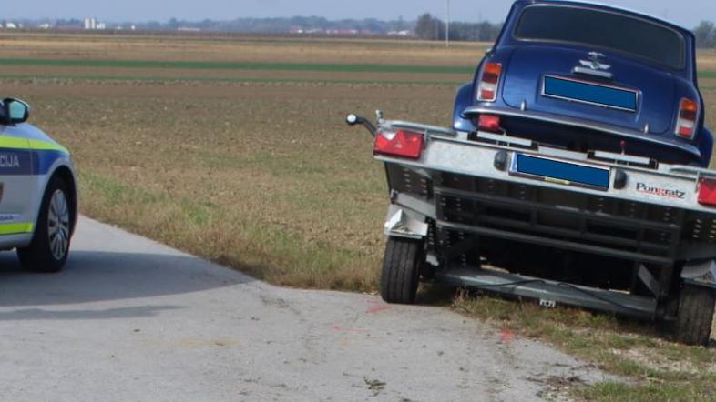 Policisti so ugotovili, da se je priklopnik med vožnjo odpel vlečnemu vozilu (avtodomu) in zapeljal čez jarek in kolesarsko stezo na njivo.