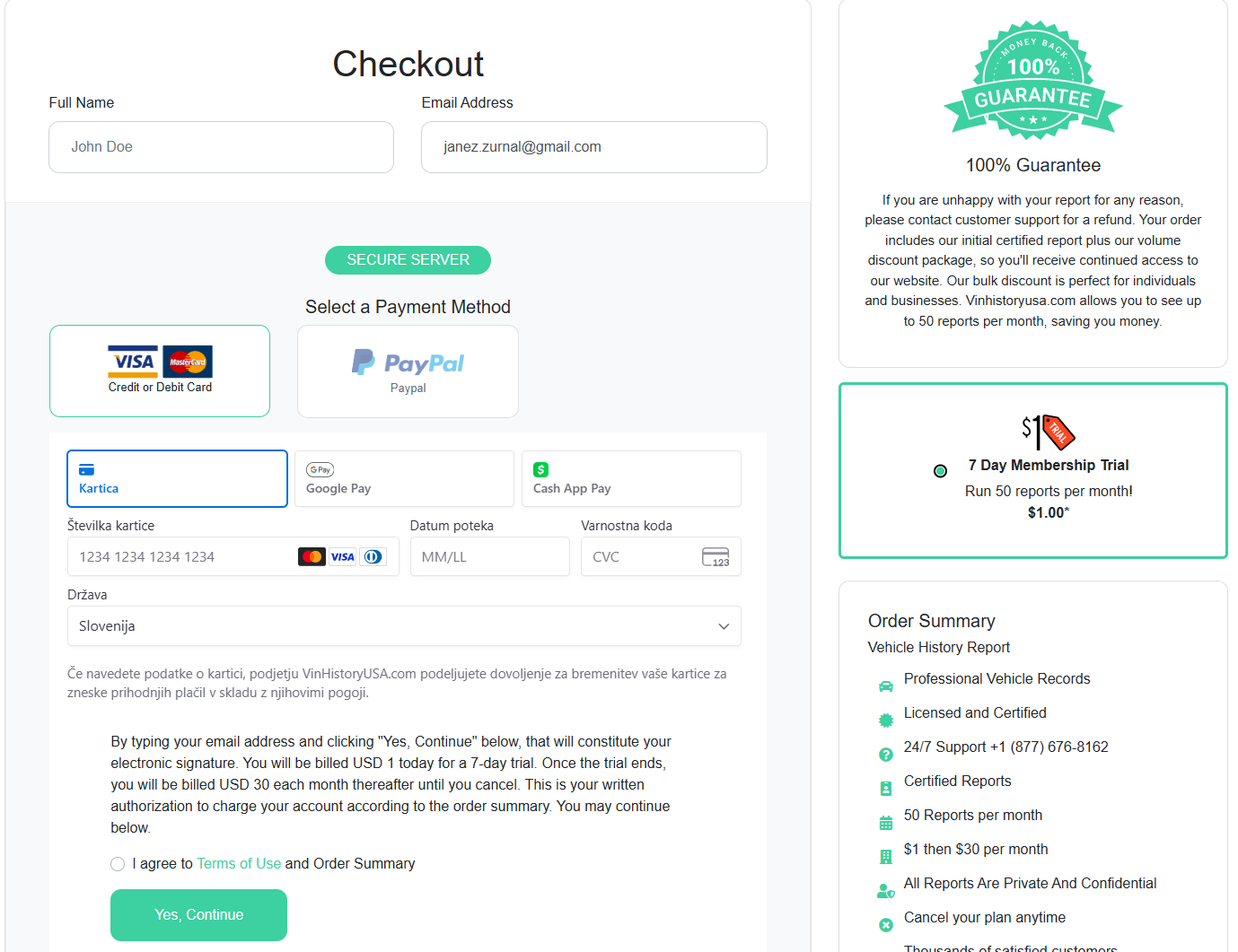 V začetku poletja sem se zanimal za nakup rabljenega avtomobila. Želel sem še naročiti poročilo na podlagi VIN številke, ki jo ima vsak avto. Prek spletnega iskalnika sem pristal na strani vinhistoryusa.com. Zdela se je kot vse druge takšne strani, ponujali so poročilo za en dolar ter vračilo denarja, če z njim nisi zadovoljen, hkrati pa bi sklenil testno sedemdnevno naročnino za, ki jo lahko kadarkoli prekineš, po testnem obdobju pa se mi zaračunalo 30 dolarjev mesečne naročnine.