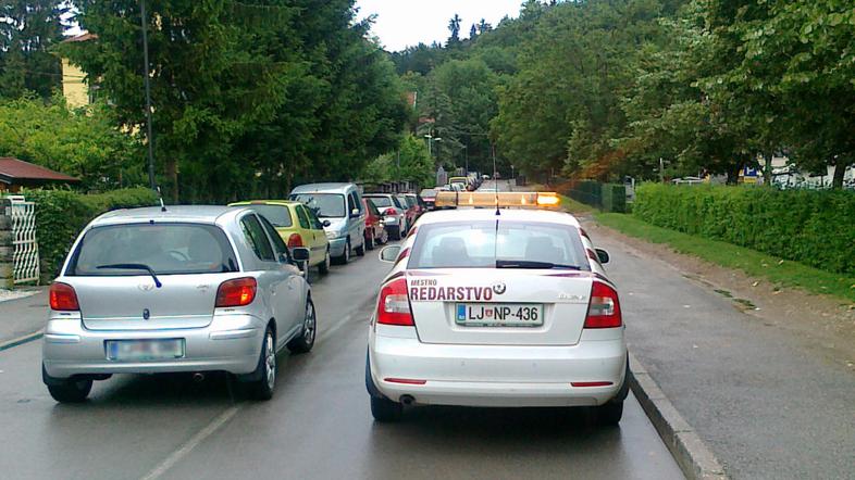 Redar si je v Rožni dolini na Svetčevi ulici privoščil privilegij in avto parkiral kar sredi ceste. Na sliki ni o redarju ne duha ne sluha, očitno pa je, da parkirani avtomobil močno ovira promet.