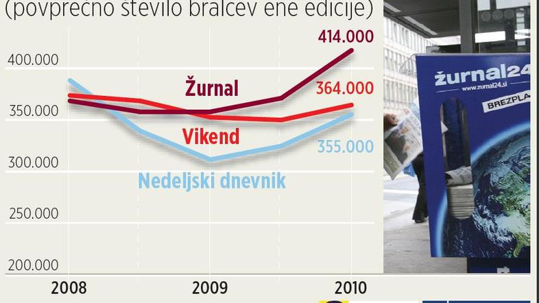 “Žurnal je prebil magično mejo 400 tisoč bralcev in je prvič 'osamljen' na vrhu, saj je razlika med njim in drugouvrščenim statistično značilna,” je povedal Andraž Zorko, direktor raziskav v Valiconu, izvajalcu Nacionalne raziskave branosti (NRB). Žurnal vsak teden bere 414 tisoč ljudi, kar je 44 tisoč več kot ob zadnjem merjenju, na lestvici najbolj branih tiskanih medijev pa mu sledita priloga Vikend (364 tisoč bralcev) in Nedeljski dnevnik (355 tisoč).