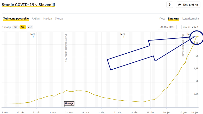 "Če slučajno ne bo šlo nazaj gor, je bil dejanski vrh PCR+ 28.1., zaradi zamikov pri brisih in analizah vzorce pa 26. ali 27.1. Vrh okuževanja pa še 4-5 dni prej. Bolj bo jasno v prihodnjih treh dneh," je na tviterju zapisal Peter Malovrh, ki na svoji spletni stran covidslo.net podrobno spremlja razvoj epidemije.