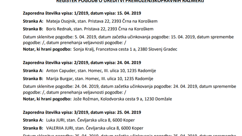 Notarska zbornica je javno objavila register parov, ki so od uveljavitve družinskega zakonika sredi aprila pa do danes sklenili predporočno pogodbo oziroma pogodbo o ureditvi premoženjskopravnih razmerij. Predsednica notarske zbornice Sonja Kralj trdi, da so bili vsi podpisniki o tem, da se bodo podatki o podpisu njihove predporočne pogodbe znašli v javnosti, seznanjeni.