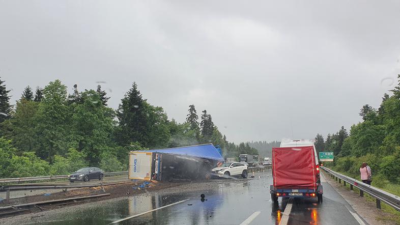 Uprava za zaščito in reševanje sicer poroča, da sta ob 16.15 na avtocesti Logatec–Unec, občina Logatec, pred počivališčem Lom trčila osebno vozilo in tovorno vozilo, ki se je prevrnilo, pretrgalo odbojno ograjo in se zaustavilo na drugem vozišču v smeri Ljubljane. Posredovali so gasilci PGD Dolnji Logatec in PGD Cerknica. V prometni nesreči se je poškodovala ena oseba, ki so jo reševalci NMP Logatec prepeljali v bolnišnico.