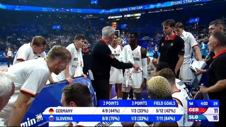 V uvodnem delu srečanja je prišlo do burnega konflikta na nemški klopi, kjer sta si v lase skočila dva nemška košarkarja. Vmes je moral poseči selektor Gordon Herbert in kazalo je že, da bo zadeva še eskalirala, preden so se napete strasti le pomirile.