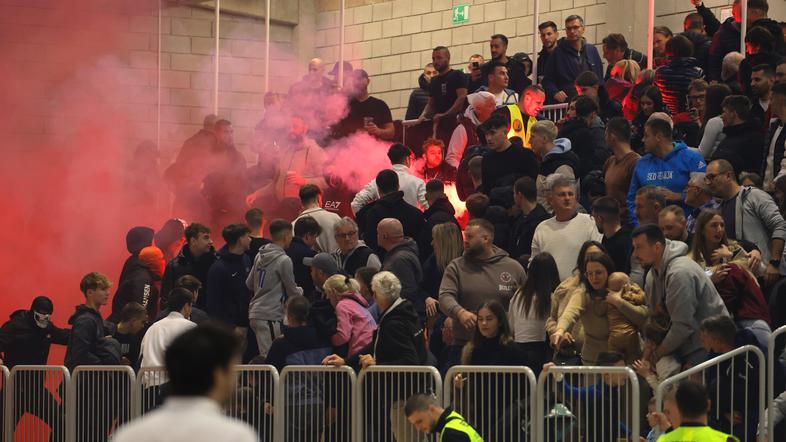 Dodali so, da so navijači pred dvorano napadli policiste in poškodovali dve policijski vozili. "Na podlagi do sedaj zbranih obvestil policisti obravnavajo več kaznivih dejanj, in sicer kaznivo dejanje poškodovanja tuje stvari, povzročitev splošne nevarnosti ter kaznivo dejanje napada na uradno osebo," so zaključili.