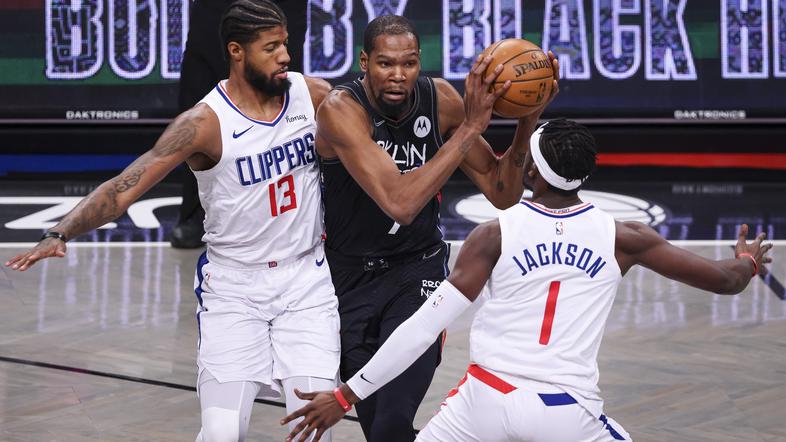 Velika trojka Brooklyn Nets - Kevin Durant, James Harden in Kyrie Irving - je prvič po prihodu Hardna upravičila pričakovanja in v severnoameriški košarkarski ligi NBA popeljala mrežice do zmage nad Los Angeles Clippers s 124:120. Pri tem je v zadnji četrtini uspešno zaustavila tudi sloviti dvojec LA Clippers, Kawhija Leonarda in Paula Georgea.