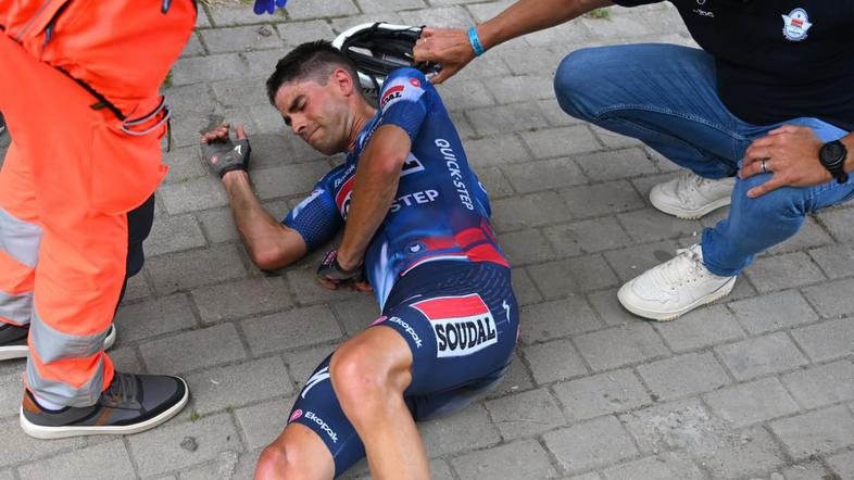 Mikel Landa je po padcu obležal na tleh. Reševalci so morali najprej zagotoviti ustrezno zaščito, šele nato so ga lahko z nosili prestavili v reševalno vozilo.