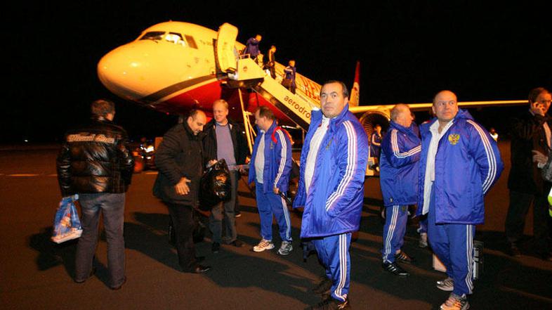 Ruski nogometaši so pozno popoldne prileteli v Maribor. Selektor ruske reprezentance Guus Hiddink je ob prihodu povedal: "Sredina tekma bo dobra in izenačena. Tudi v Moskvi je bila dobra tekma, a so Slovenci uspeli zadeti v zadnjih minutah, kar jim daje malo upanja. Mi smo dali na sobotni tekmi dva gola, možnost smo imeli, da bi jih dali še več, a jih nismo. Imeli so srečo, da so dali gol, zato bo ta tekma za obe strani napeta in zanimiva." Ali Rusi občutijo kaj pritiska, ko je še vse odprto? "Na vsaki mednarodni tekmi je nekaj pritiska – za obe strani. Oni morajo zadeti, mi moramo zadeti. Vedno je pritisk. Slovenci imajo močno obrambo, kar so dokazali v kvalifikacijah, saj so dobili le štiri gole."