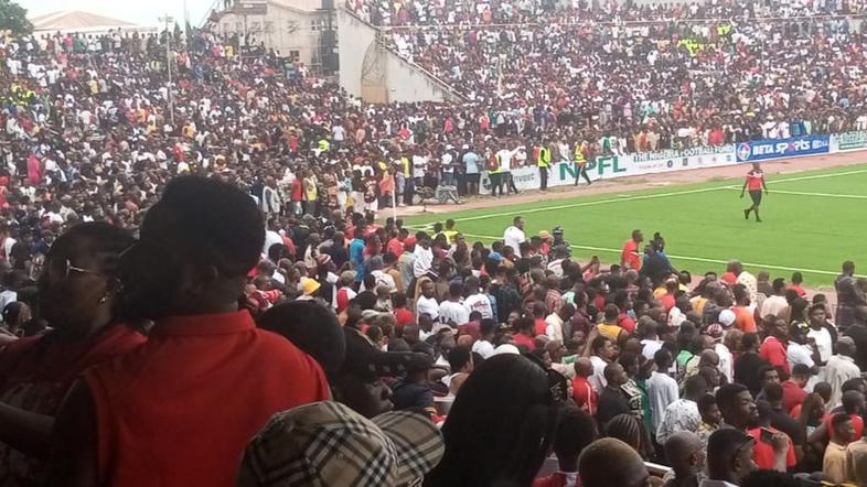 Ključni derbi v najmočnejši nigerijski nogometni ligi med vodilnima ekipama Enugu Rangers in Enyimbo je bil v nedeljo zvečer prekinjen, potem ko so sodniki domači ekipi dosodili enajstmetrovko, gostje pa so odšli z igrišča. Nato je na stotine navijačev vdrlo na igrišče.
